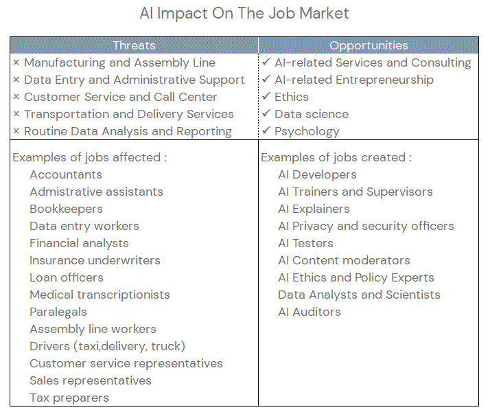 - Economic Impact: The disruptive nature of AI on the job market can have broader economic implications. Displacement of workers and changes in job structures can result in income inequality, unemployment challenges, and the need for social safety nets and retraining programs to support affected individuals and ensure a smooth transition.