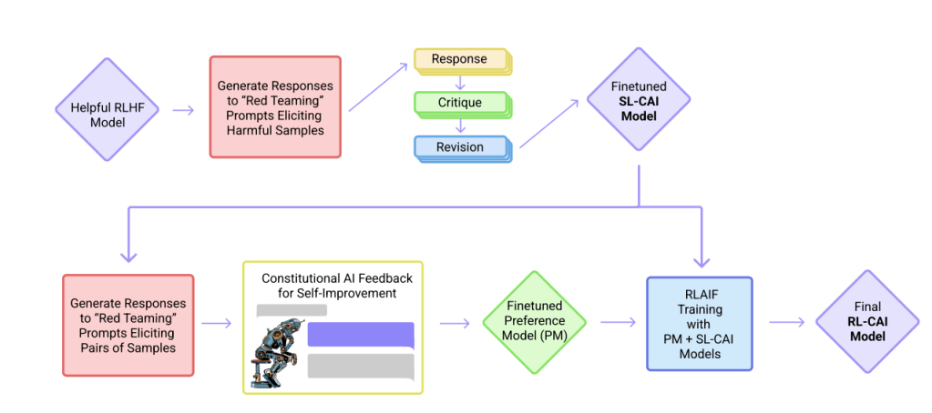 Supervised Learning and Self-Critique: The training process involves an initial supervised learning phase in which the AI system generates responses to various challenging prompts, critiques its own responses based on the constitutional principles and suggests revisions that better align with the constitution. The revised responses are used to fine-tune the AI system to improve its adherence to the constitution.