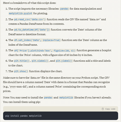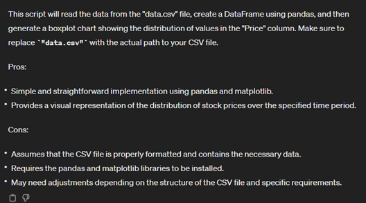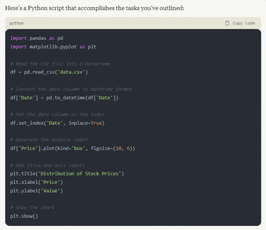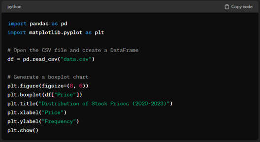 This test aims to assess the chatbot’s ability to write Python code for data manipulation and visualization. The chatbot will be tasked with creating a Python script that opens a CSV file, creates a DataFrame from the data, and generates a boxplot chart.
