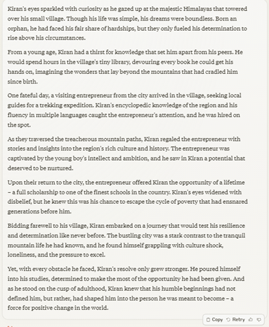 This test aims to assess the chatbot’s ability to creatively generate a detailed story based on an initial short narrative. The chatbot will be presented with a story starter about an orphan boy and will be tasked with continuing the narrative in a creative and engaging way.