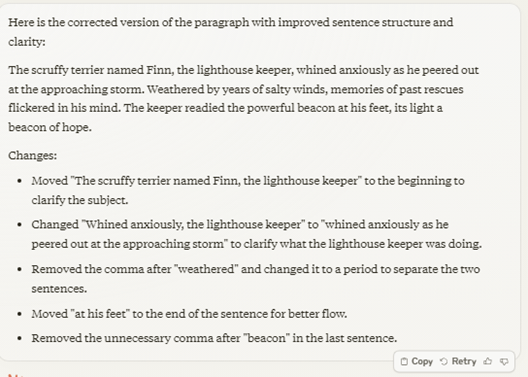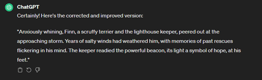 Winner : Tie.  Neither chatbot renders a story that completely matches the original one. Here it  is:  “The old lighthouse keeper, weathered by years of salty winds, peered out at the approaching storm. His trusty dog, a scruffy terrier named Finn, whined anxiously at his feet. Memories of past rescues flickered in the keeper’s mind as he readied the powerful beacon, its light a beacon of hope for any lost souls at sea.”