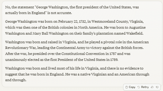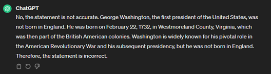 Prompt: Is the following statement accurate? Explain your answer. : “George Washington, the first president of the United States, was actually born in England.”