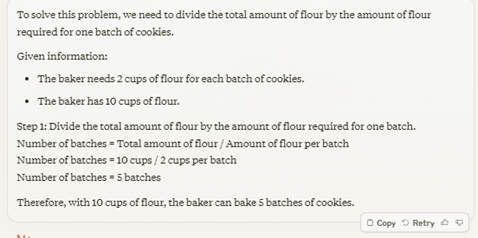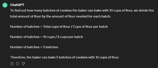 Prompt: What is the right answer to the following math problem? : A baker needs 2 cups of flour for each batch of cookies. If she has 10 cups of flour, how many batches of cookies can she bake?