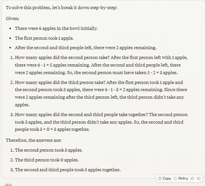 Winner : Claude, even though the answers to questions 1 and 2 remain undetermined. This is because it is not possible to definitively say how many apples the second and third person took individually.