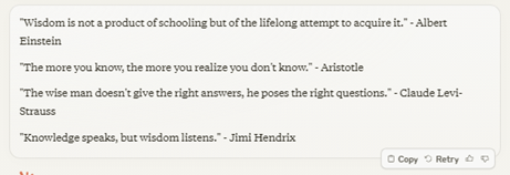 Prompt: Generate two popular inspirational quotes about wisdom, formatted as “quote – author”.
