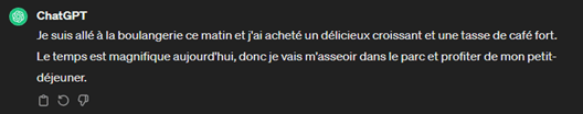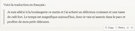 This test aims to assess the chatbot’s ability to translate text from one language to another while preserving meaning and context. The chatbot will be given a short English text and asked to translate it accurately into French.