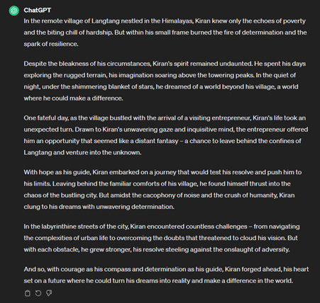 Prompt: Write a short story (approximately 300 words) about an orphan boy named Kiran who grew up in a small village nestled in the Himalayas. Despite facing poverty and hardship, Kiran is a bright and determined young boy. He dreams of one day escaping his circumstances and making a difference in the world. When a chance encounter with a visiting entrepreneur opens up new possibilities, Kiran embarks on a journey that takes him from his humble village to the bustling city, where he must overcome numerous challenges to achieve his goals.
