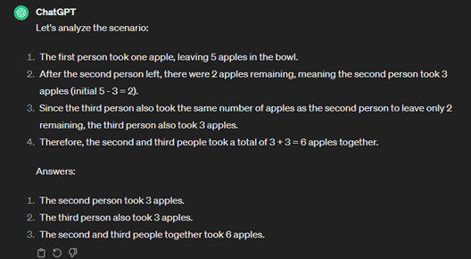 This scenario will test the chatbot’s ability to follow logical reasoning and solve a puzzle. The scenario involves four people, six apples, and the remaining number of apples after some have left the room.