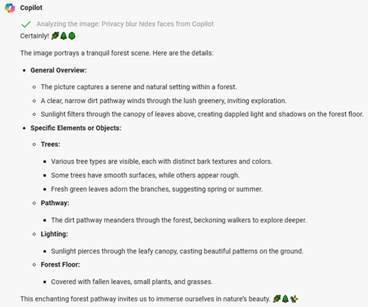 The first step involve analyzing an original photograph. We upload the image to Copilot and ask it to generate a detailed description. This description captures the key elements and atmosphere of the photo.