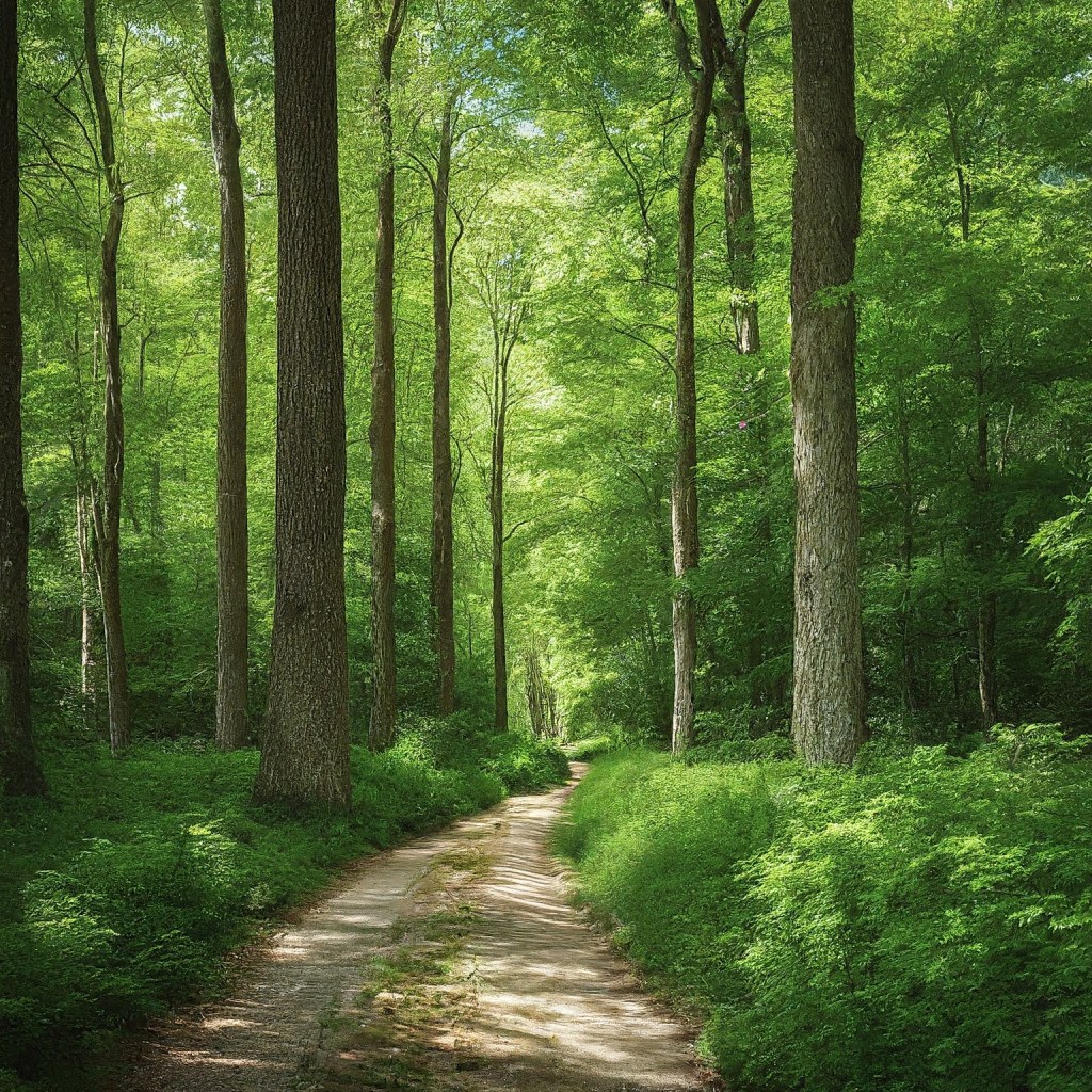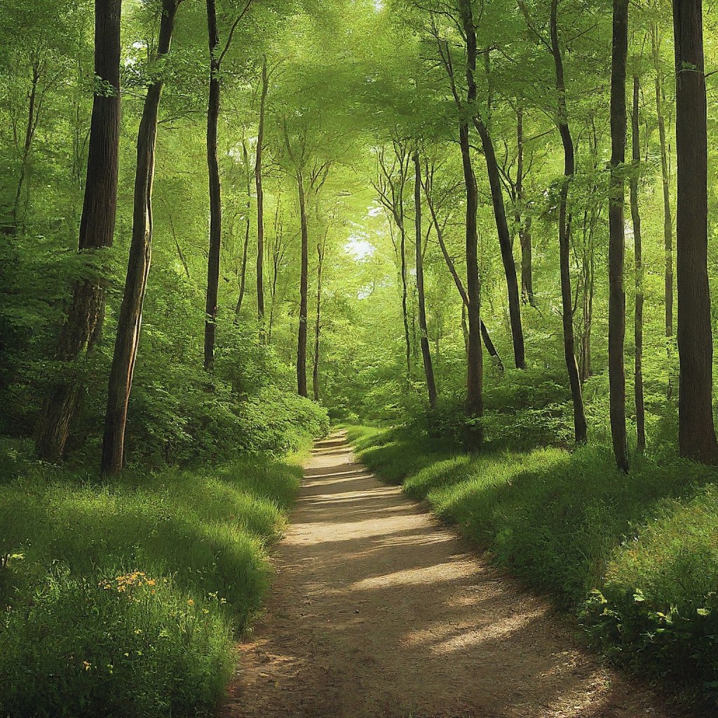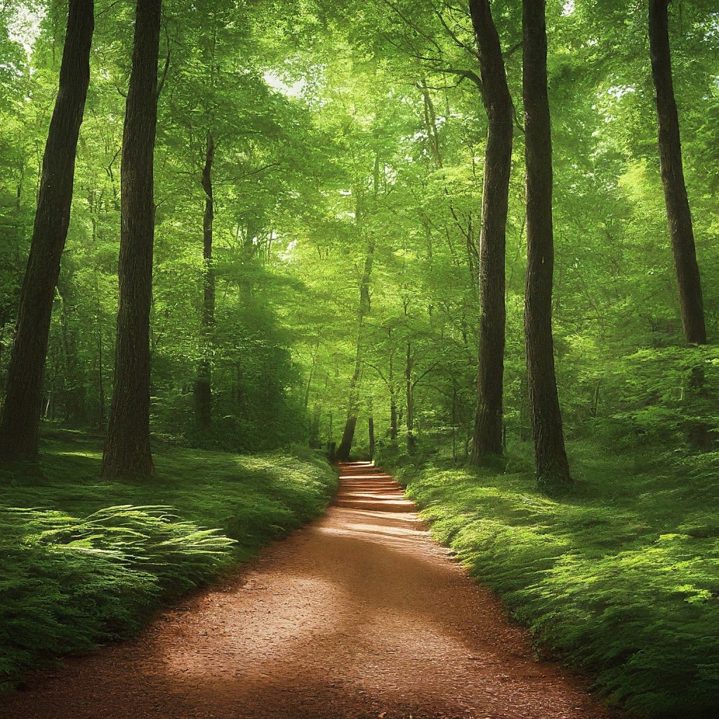 This serene forest image features a narrow dirt pathway winding through lush greenery. Sunlight filters through the leafy canopy, casting dappled shadows on the forest floor. Various tree types, with distinct bark textures and fresh green leaves, create an inviting atmosphere. It’s a tranquil scene that beckons us to explore nature’s beauty.”