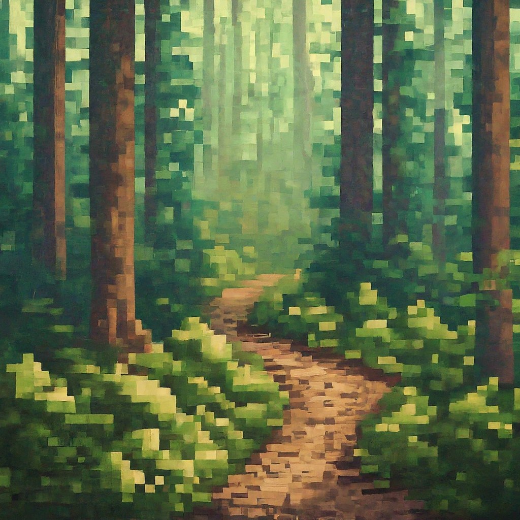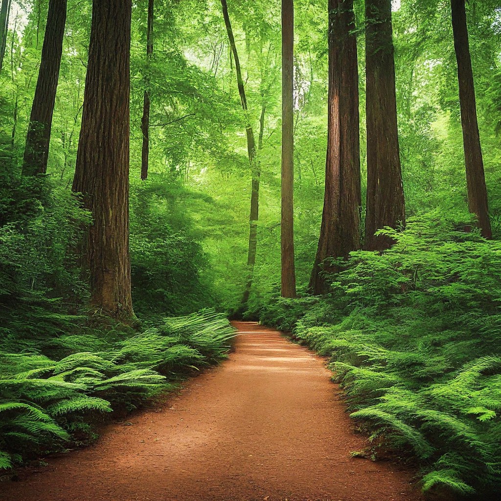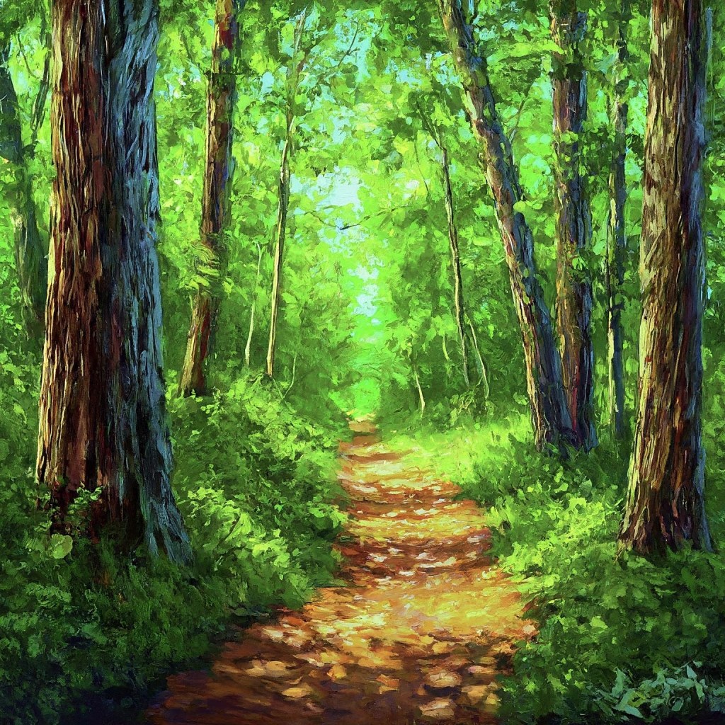 This serene forest image features a narrow dirt pathway winding through lush greenery. Sunlight filters through the leafy canopy, casting dappled shadows on the forest floor. Various tree types, with distinct bark textures and fresh green leaves, create an inviting atmosphere. It’s a tranquil scene that beckons us to explore nature’s beauty.”