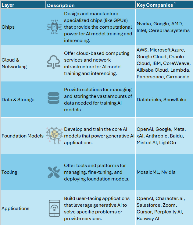 The US boasts a vibrant and rapidly growing gen AI ecosystem, comprising over 1,500 companies spread across six interconnected layers as summarized below.